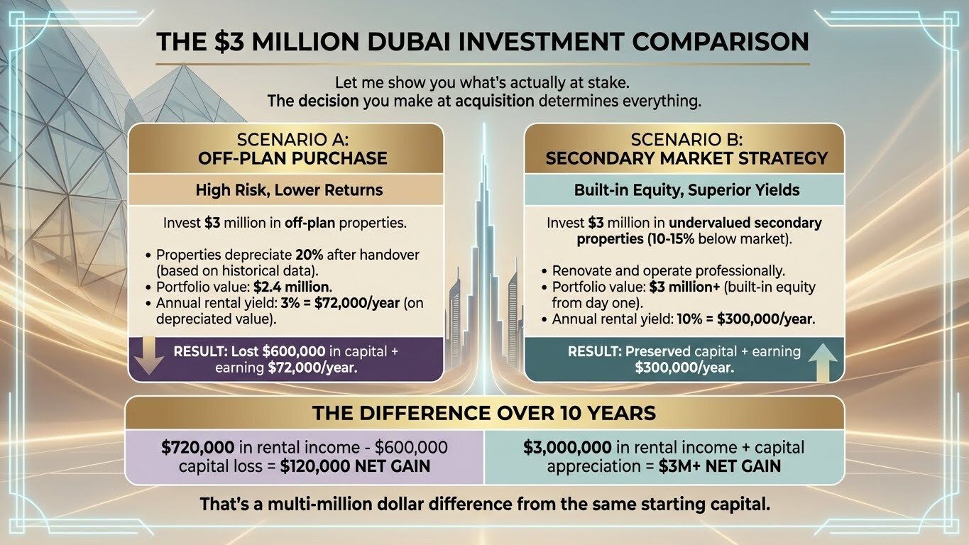Now I'm watching my secondary market properties generate 12% net annually while those off-plan units sit there, not producing a single dirham, waiting for handover.